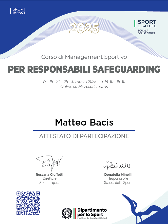 Il Consiglio ritenendo sussistenti in capo al sig. Bacis Matteo i requisiti richiesti per la nomina di Responsabile Safeguarding, nomina il sig. Bacis Matteo. Responsabile Safeguarding con lo scopo di prevenire e contrastare ogni tipo di abuso, violenza e discriminazione sui tesserati nonché per garantire la protezione dell'integrità fisica e morale degli sportivi.